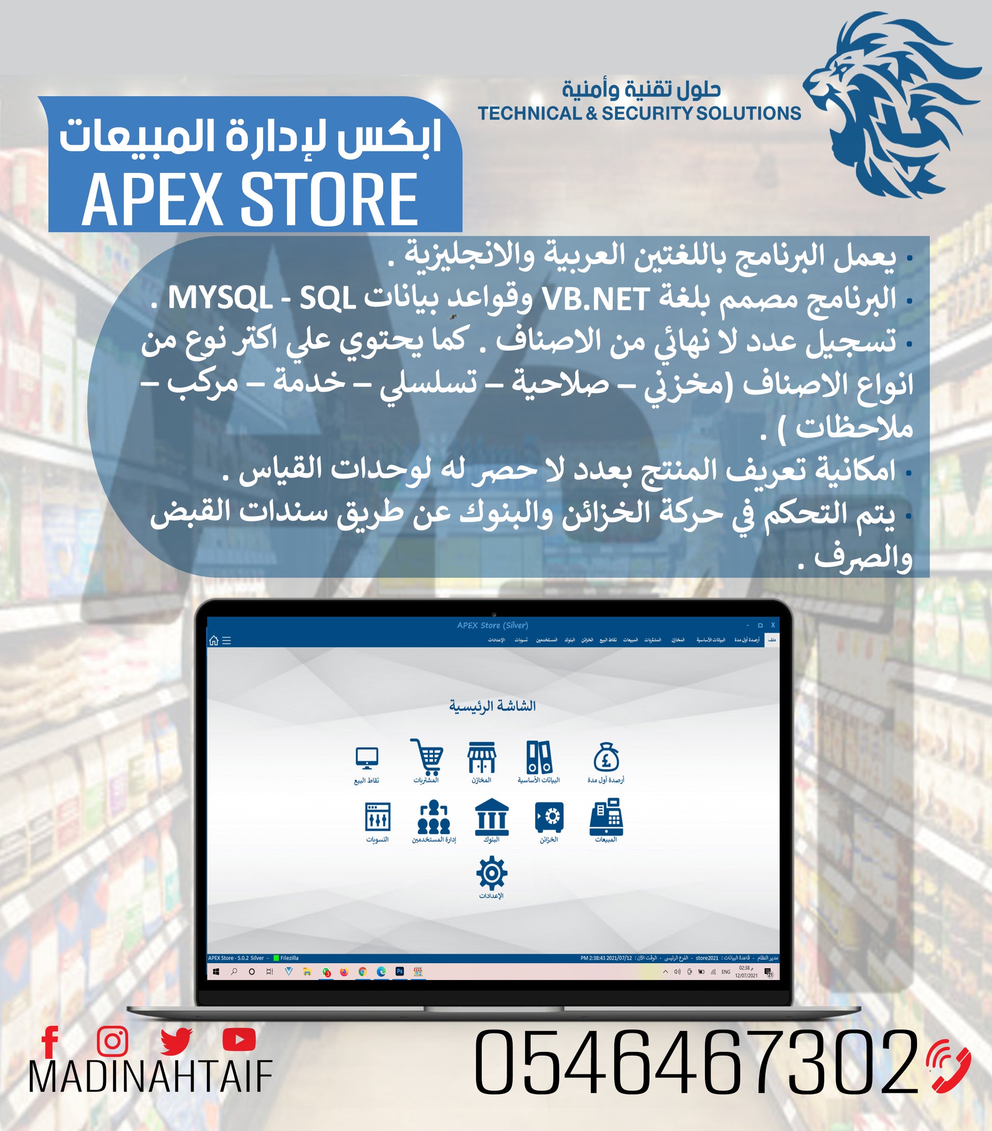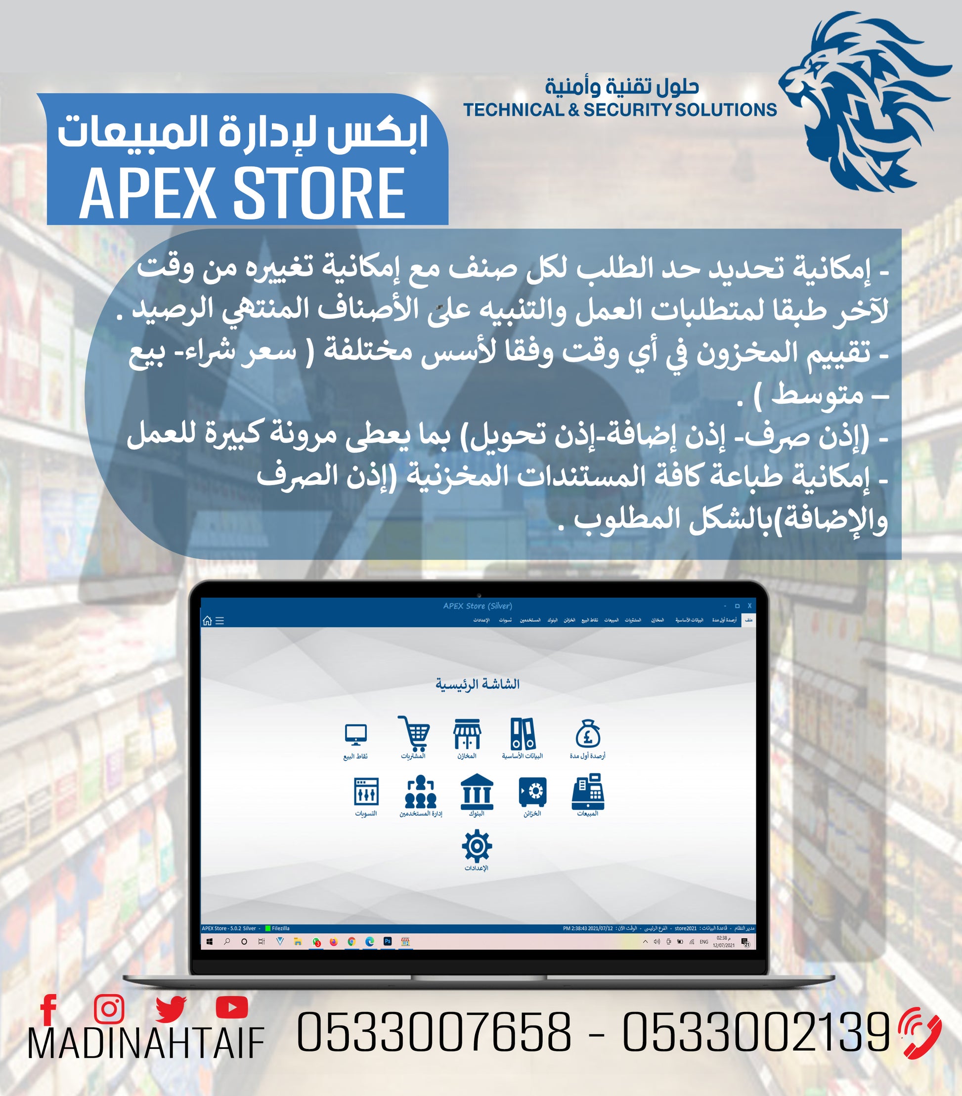Inventory, sales, purchases and point of sale management program to deal with all activities related to sales affairs, provides you with comprehensive and detailed system reports for each branch and each user, in addition to issuing invoices, entering data and managing items with absolute ease, creating an integrated system that enables you to perform your work without any complications, you can get it now from Taif Al-Almas store.