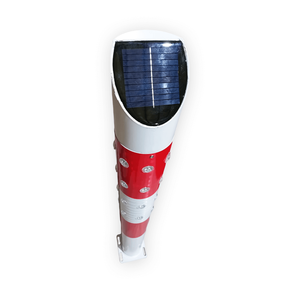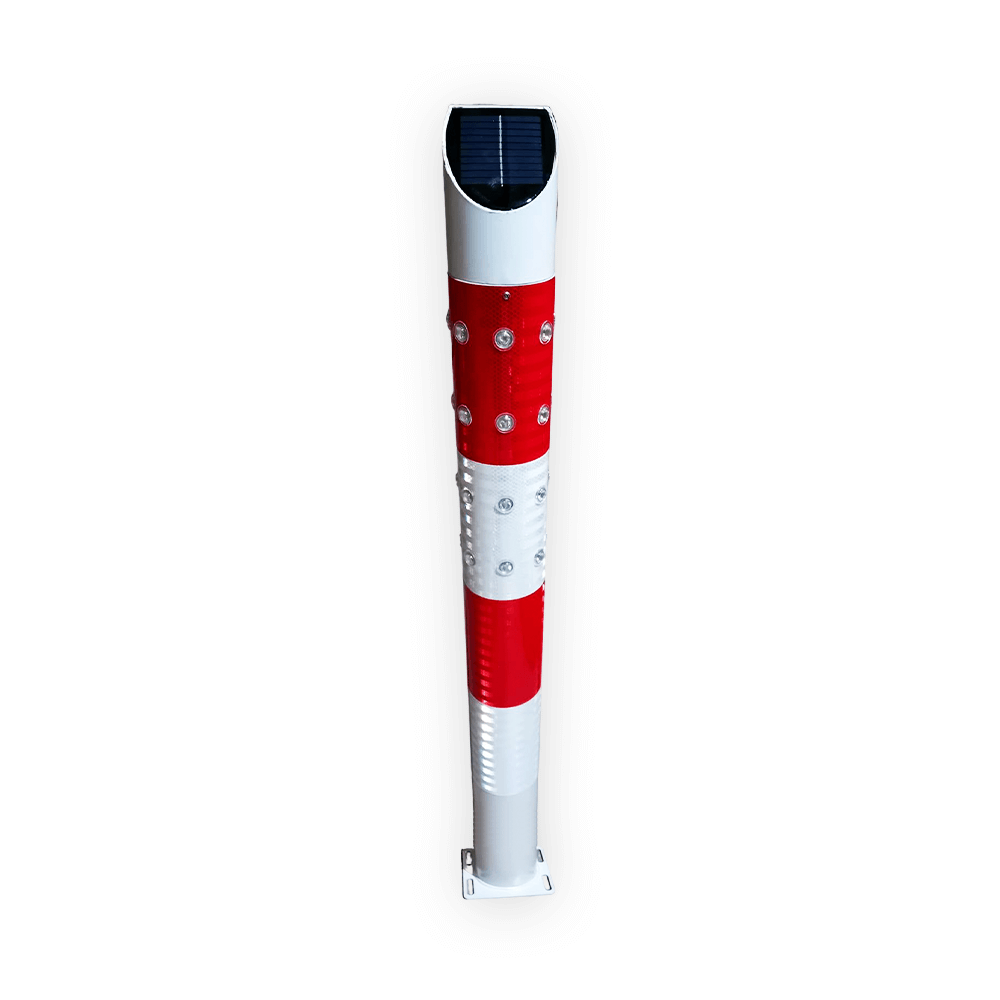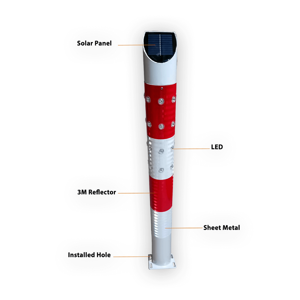 كما يتميز العمود بهيكل معدني مطلي بطلاء كهروستاتيكي لمقاومة الظروف الجوية القاسية، إضافةً إلى شريط عاكس من 3M لتعزيز الوضوح الليلي.