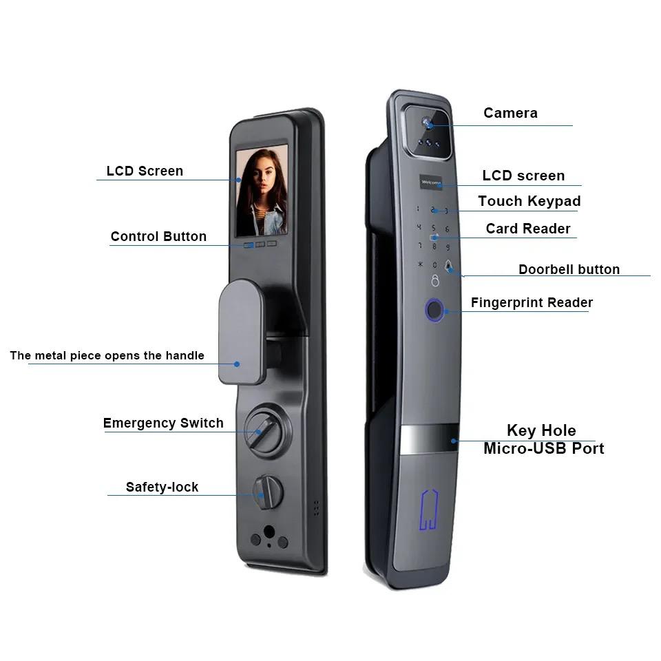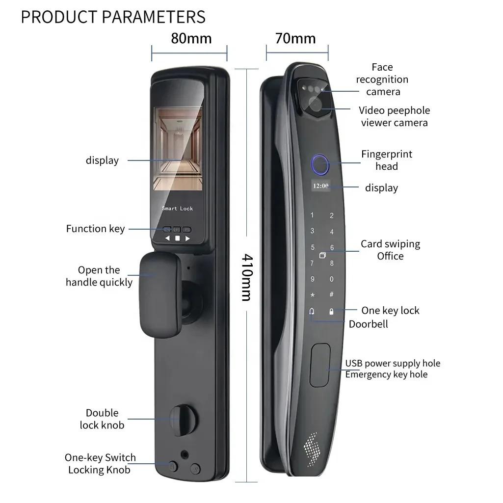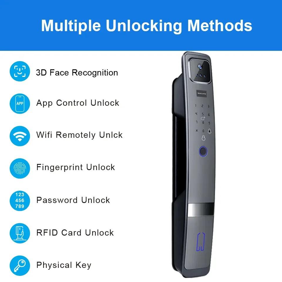 طرق فتح متعددة: بصمة، تطبيق الهاتف الذكي (Tuya App)، كلمة مرور، بطاقة، مفتاح تقليدي، أو عبر التعرف على الوجه.